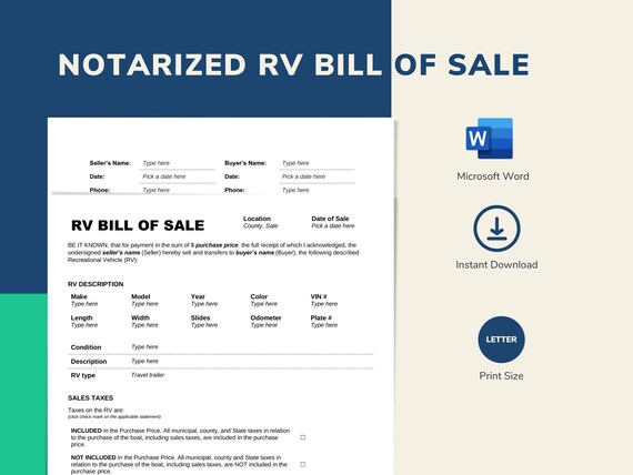 Notarized Rv Bill Of Sale Form Printable Editable Template 2 Etsy